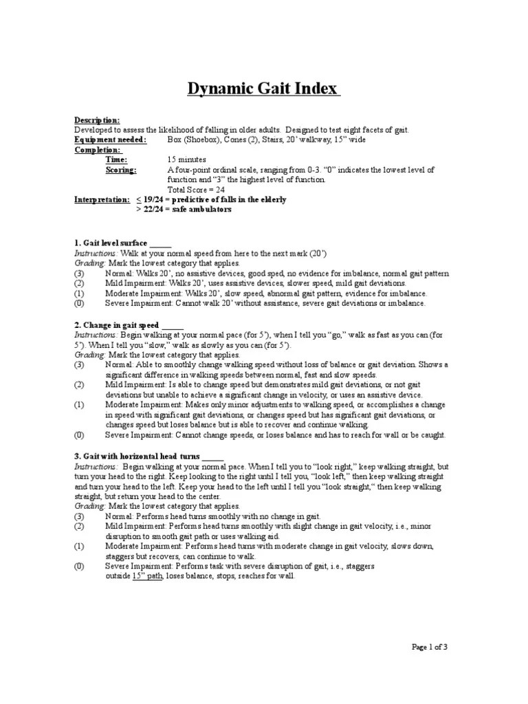 The Dynamic Gait Index DGI was developed to assess the likelihood of falling in older adults by testing eight facets of gait. Gait on level surface change in gait speed gait with horizontal and vertical head turns gait with 180 pivot turn stepping over obstacles gait with narrow base of support gait with eyes closed backwards gait and stairs. Scoring Each item is.
