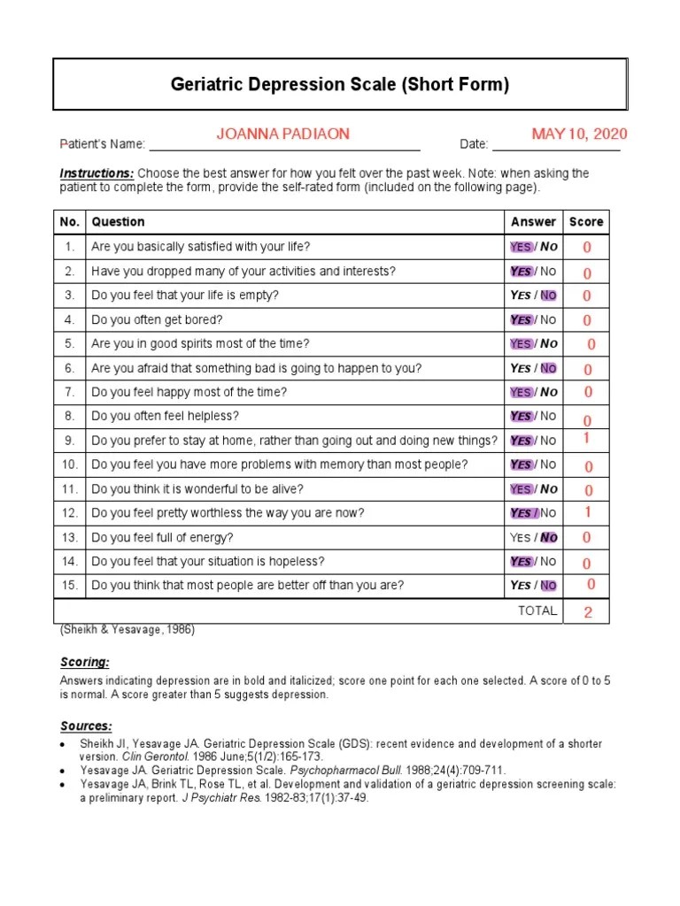Depression is a common psychiatric disorder in older people. Each answer counts one point. Geriatric Depression Scale Long Form Patients Name.
